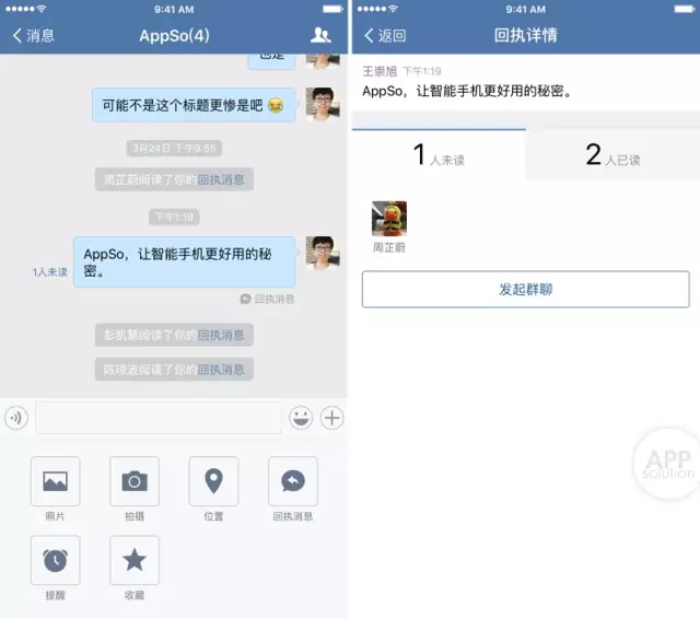 4. 回执消息我们知道,微信一直拒绝为消息加入消息已读通知,这个功能对不少人来说不仅是一种社交压力,更可能是一种隐私的侵犯。企业微信的「回执消息」大概是最让人喜欢的一个功能:当消息发送者选择发出一条回执消息后,会在消息接受者阅读后收到一条通知「xxx 阅读了你的回执消息」(同样适用于群)。微信官方认为: