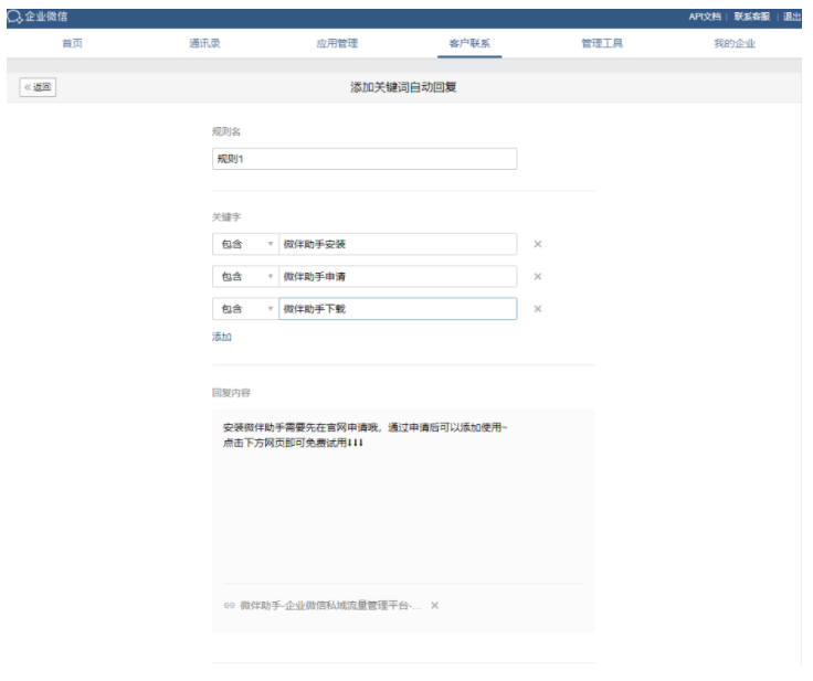 企业微信有群机器人功能,实际上是通过企业微信自动回复功能实现的。我们可以在企业微信管理后台,客户联系功能中找到自动回复功能,设置关键词自动回复,每一个关键词对应的回复内容是什么,直接设置关键词自动回复规则就好了。设置完成后,群主在群聊中打开自动回复,群机器人小助理加入群聊,整个配置工作就做好了,企业可以在管理后台设置多条关键词自动回复规则。当群成员艾特小助理时,会自动匹配关键词,回复对应的消息。比如配置一些关于产品介绍、活动流程、发货时间、安装方法这类客户问的比较多的内容,机器人会整体提高企业的群运营效率,比如原先...