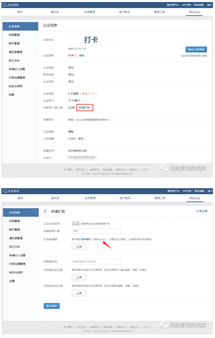 不用担心,企业微信是可以扩容的,向企业微信提交申请扩容就可以啦!扩容申请公函怎样下载?企业认证或验证后,可登陆管理后台。在 “我的企业- 已使用人数上限-申请扩容” 入口进行申请,点击申请后,在扩容申请填写信息页面可下载扩容申请函。扩容申请公函怎样写?请按照公函中模板内容填写,按照实际情况申请。注意:申请人代表签名不支持盖签名章,需手写。1000人或以下申请函的模板1000人以上申请函的模板企业微信授权服务商,客服电话:4006601126。更多企业微信的问题,扫描下方二维码免费咨询!...
