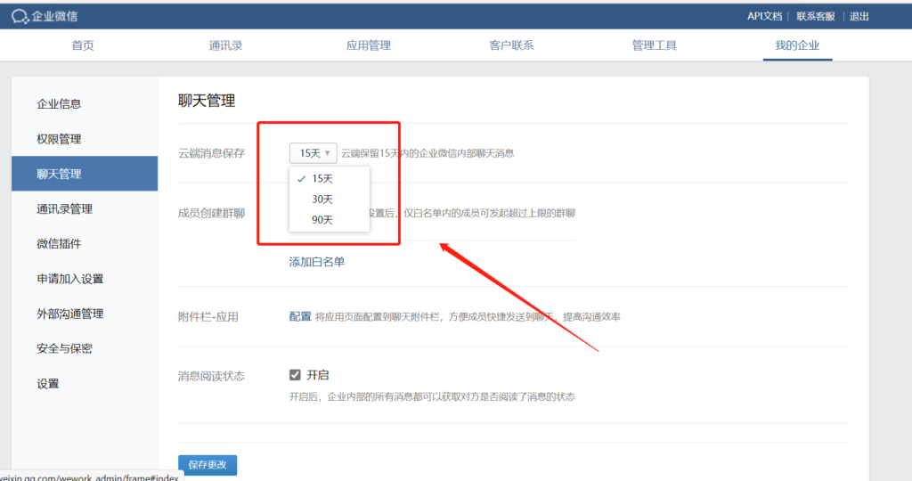 目前企业微信内部消息记录默认在云端保存15天,管理员也可以在企业微信管理后台【我的企业】-【聊天管理】中设置保存时长。目前可设置15天,30天,90天。如不更换登录设备,消息记录会在设备本地一直保存哦。 扫描下方二维码,添加我们专业的企业微信顾问!企业微信授权服务商,客服电话:4006601126。...