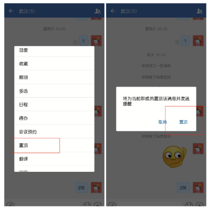 除了将联系人或群聊置顶外,在企业微信中我们还可以将群聊中的消息置顶,方便群成员查看重要消息,避免遗漏。这时只需要在群聊中长按该消息,在弹窗中选择置顶就可以了。