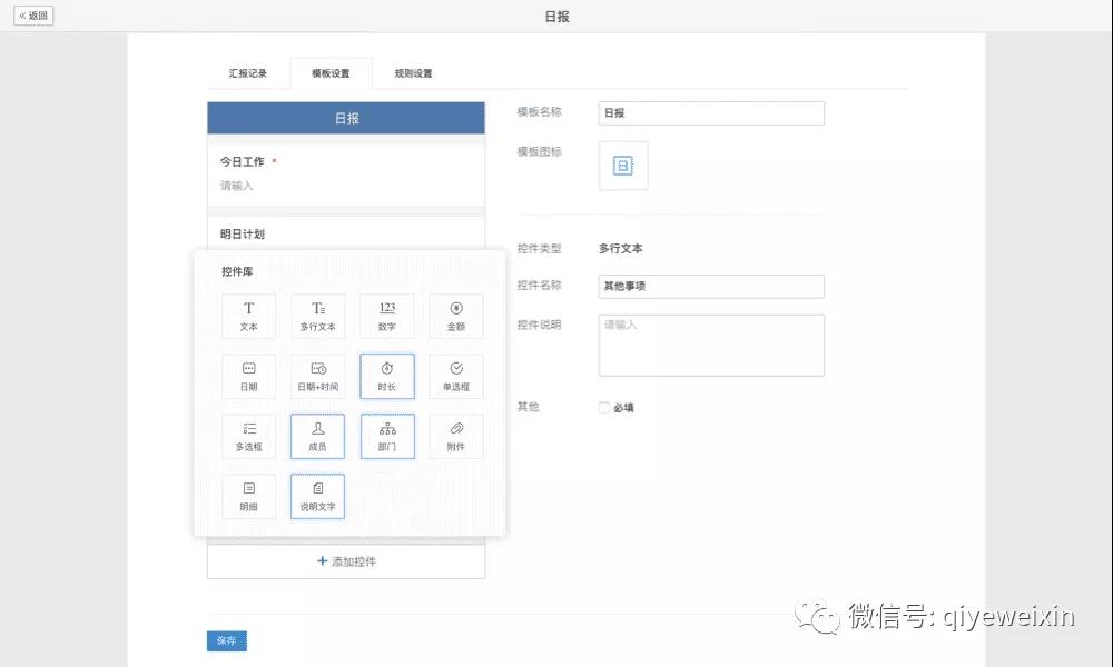 3.【汇报】新增时长、成员、部门、说明文字控件,可在管理后台设置内容更丰富的汇报模板了。