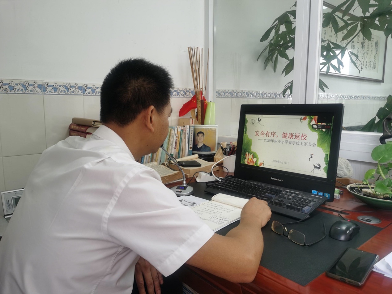 (赤沙小学校长李锦贤通过企业微信召开复学前的线上家长会)