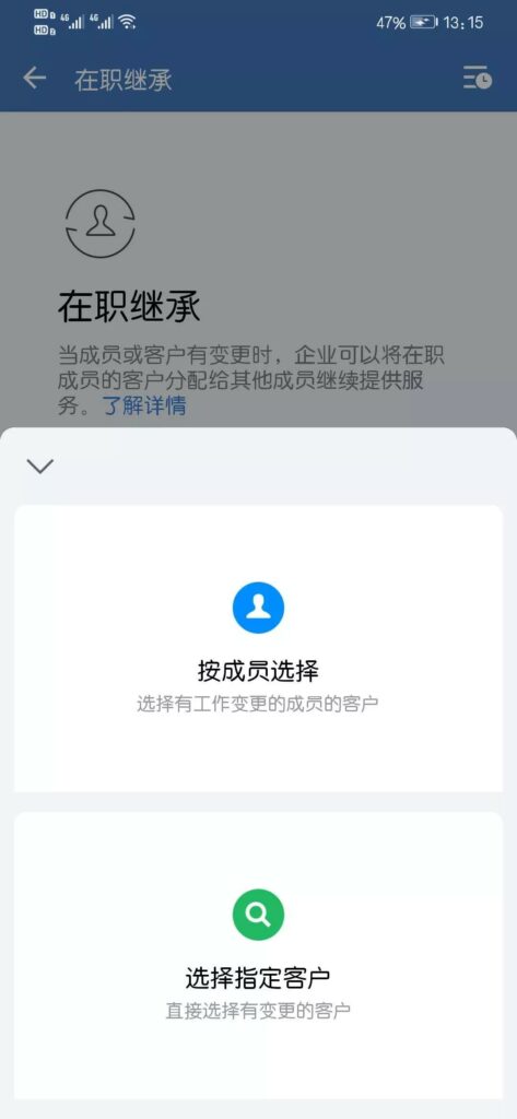 第二步:进入在职继承功能,选择需要分配的客户,这里企业微信提供了两种方式:按员工分配与按客户分配。