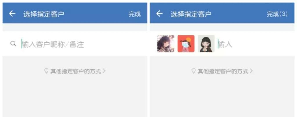 按照客户分配:直接输入客户昵称搜索,依次添加需要分配的客户。