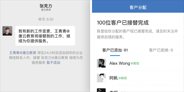 这时如果公司员工比较多,无法提供那么多的微信号,可以使用企业微信联系客户。因为企业微信有离职分配功能,一旦员工离职,管理员可以立即将离职员工的客户分配给其他同事服务。