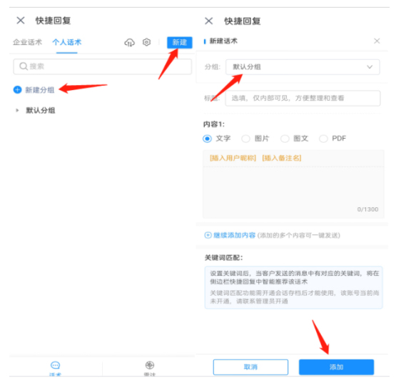 企业微信的快捷回复分为两种:企业话术和个人话术