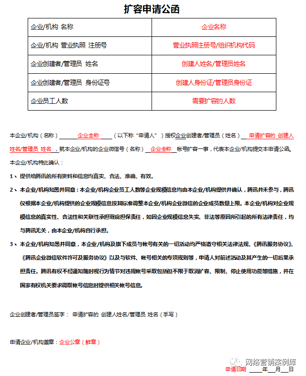 企业认证或验证后,可登陆管理后台。在 “我的企业- 已使用人数上限-申请扩容” 入口进行申请,点击申请后,在扩容申请填写信息页面可下载扩容申请函。