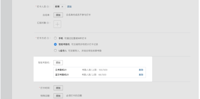 若打卡方式为智能考勤机,则需要根据设备名称选择具体的考勤机,该规则下的打卡人员只能在指定考勤机上打卡。每台考勤机有相应的人数上限,不能选择人数超限的考勤机作为打卡设备。