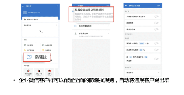 每个客户群都有运营规则,但是总会有不遵守规则的客户。企业微信客户群拥有全面的防骚扰规则,如果客户在群里面发消息包含某些关键词或者发广告时会自动踢出。不仅可以踢出群,还可以禁止恶意客户再次入群。