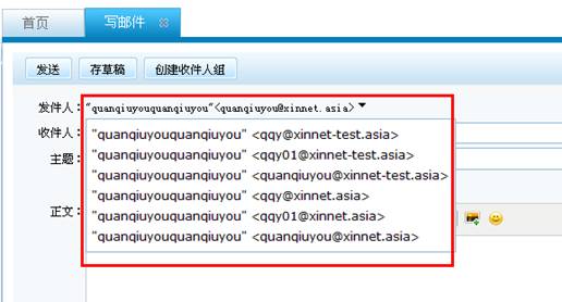 员工在写信时,可点击发件人右侧三角形下拉按钮,选择发出的邮件别名,收件人会收到显示该别名的邮件。如下图: