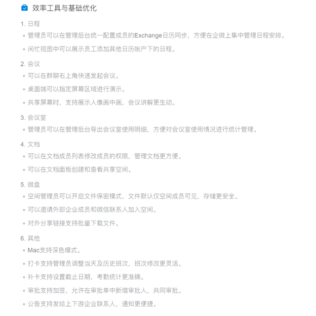 此次更新中,日程、会议、会议室、文档、微盘等工具均有功能优化,详见下图。