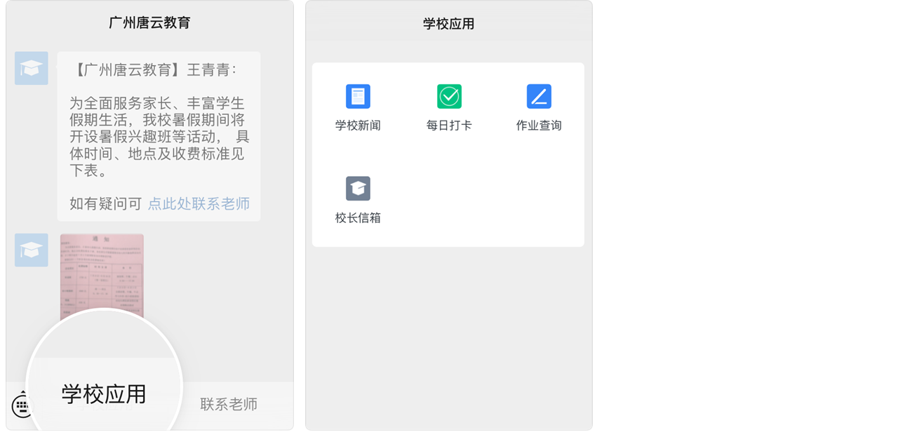 什么是企业微信“家长可使用的应用”,如何配置?家长可以在「微信-通讯录-学校通知-学校应用」中使用学校配置的校园应用,接收这些应用所推送的消息,提交学生请假、缴纳学费等申请;在手机端,管理员可进入“家长通知-配置家长应用”中配置这些应用。注意,目前仅支持添加主页型的自建应用和主页型的第三方家校应用。注:主页型应用,即设置了工作台应用主页的应用;第三方应用市场中的“教育行业方案”已经上线,欢迎前往挑选试用。或登录管理后台,进入“家校沟通-配置-家长可使用的应用”中进行相关操作。...